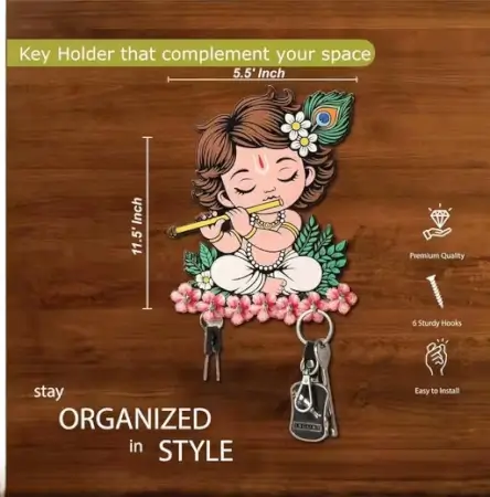 Premium Little Krishna Wooden Wall Key Holder – Multicolor Decorative Organizer ( default, Standard )